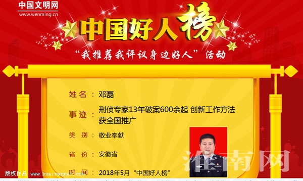 好人是照亮我們前行的“明燈”,模范是給我們榜樣力量的“大樹”,在他們身上閃光的是高尚的品行。他們引領一方風氣!日前,中央文明辦在延安舉辦全國道德模范與身邊好人現場交流活動,并發布了5月“中國好人榜”,刑偵專家鄧磊創立追逃工作法做有案必破的守護神,上榜2018年5月“中國好人榜”。