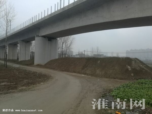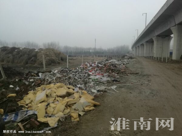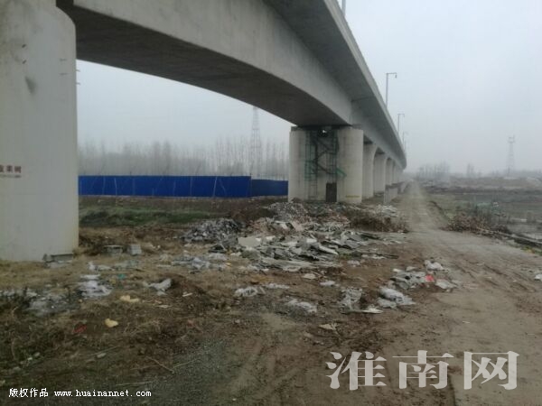 淮河早報、淮南網記者沿著鐵路橋下方的小路往南,看到小路邊被傾倒了成堆的垃圾,形成了一條一兩百米長的垃圾帶。