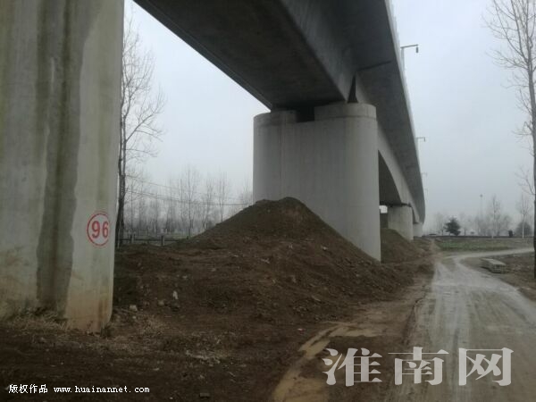 2月16日下午,淮河早報、淮南網記者沿著夏郢孜西路向西,來到與商合杭鐵路橋交匯處,遠遠看到,在路北側橋梁下方,有幾堆堆積如山的土堆。走近看到,渣土堆共有3處,有的高度超過2米,最大的一處長約10米。這些渣土直接在橋梁下露天堆放,沒有采取覆蓋等防塵措施。