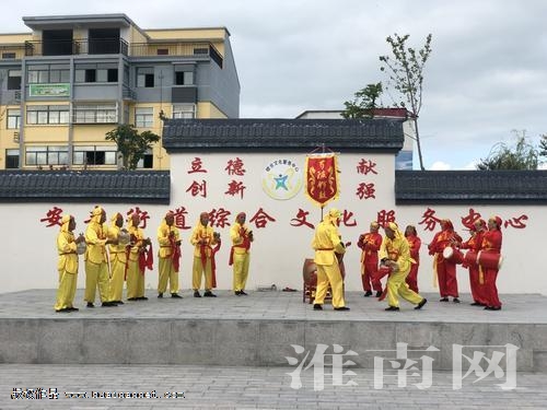走在安豐塘西岸的堤壩上,正前方是小橋、流水和涼亭的景觀塘,相隔著村民健身活動廣場的是一排排外立面貼有歷史文化浮雕的徽式連戶別墅區,不遠處則是灰瓦白墻、整齊劃一的住宅樓,整個小區的街道整潔、干凈、綠植環繞。保潔員正在小區里打掃衛生,還有一輛灑水車響著音樂正在穿梭灑水。在2200平方米的村民健身活動廣場上,一支鑼鼓隊正在舞臺上酣暢地敲著鑼、打著鼓。