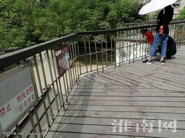 10月2日,在龍湖景區(qū)動植物園內,游客無視“禁止拋投雜物、擅自投食”的警示牌,隨意向小動物投放食物。(記者)