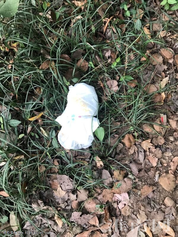 10月2日,八公山風景區內一游客在給孩子換完尿不濕后隨手把尿不濕扔進草叢,保潔人員都難以打掃。(記者)