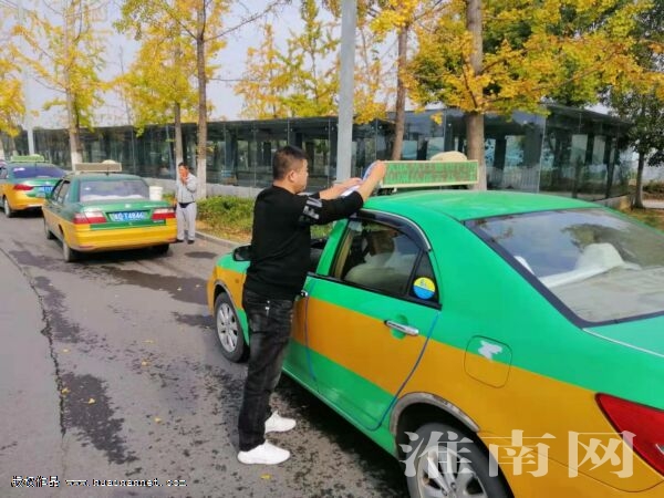 近日上午,908淮南愛心車隊聯合建興路保潔服務站,組織人員來到淮南東站,給等待載客的出租車更換老舊破損的創城標識車貼,為創建全國文明城市貢獻自己一份力量。(記者 陳崇韌)