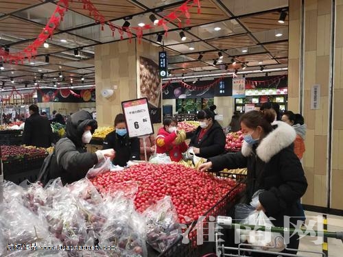 在華潤蘇果淮南龍湖南路購物廣場,門口及賣場醒目位置都放有“請市民出入公共場所佩戴口罩”“電梯扶手、購物籃、購物車今日均已消毒”的溫馨提示牌,賣場內人流量相對平穩,蔬菜瓜果、肉類及消毒專柜前人流量相對較大。該購物廣場負責人表示,賣場內銷售的日常生活必需品會結合兩種采購方式,一種是總公司分配,保證每天供應的品種;第二種是結合當地的地產,從淮南市場采購保證供應。目前,賣場里貨源非常充足,可以保證廣大市民的需求。但消毒用品比較緊俏,賣場也會根據需求進行限購,確保消費者到店就能買到。而生活必需品的價格由總部統一管控,會根據每天的市場價格和供給,保證平價銷售,敏感商品甚至零毛利銷售!拔覀兂袑茨鲜袌龅某兄Z是:不漲價,保供應。像干貨、蛋品、蔬菜品種有百余種,水果也有近百種銷售,能夠滿足日常需求,且價格比年前略低。”
