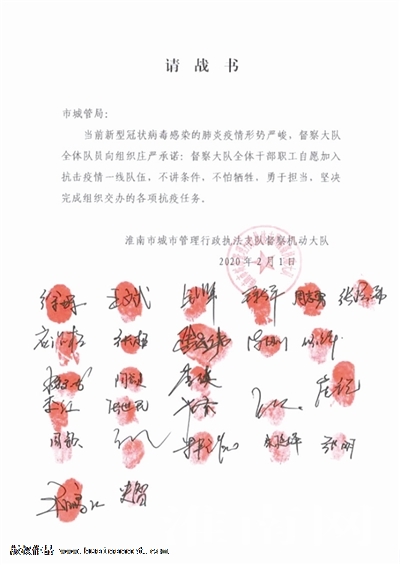 (記者 李嚴)“當前新型冠狀病毒感染的肺炎疫情形勢嚴峻,督察大隊全體隊員向組織莊嚴承諾:我們自愿加入抗擊疫情一線隊伍,不講條件、不怕犧牲、勇于擔當,堅決完成組織交辦的各項抗疫任務。” 2月1日,市城管督察機動大隊全體黨員干部鄭重地在 “請戰(zhàn)書”上按下了自己的手印,用實際行動率先向市城市管理行政執(zhí)法局黨組主動請戰(zhàn)。