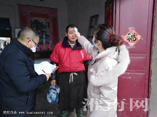 圖為壽縣眾興鎮(zhèn)衛(wèi)生院副院長(zhǎng)、婦聯(lián)執(zhí)委劉青華入戶(hù)進(jìn)行體溫測(cè)量。