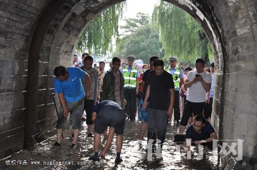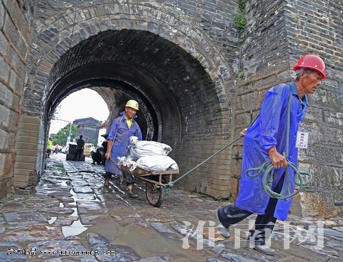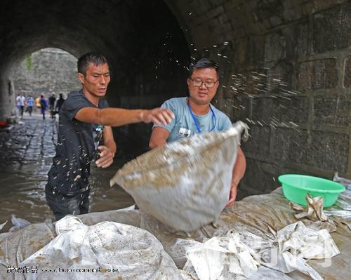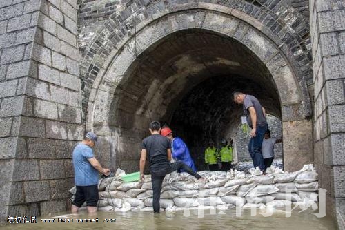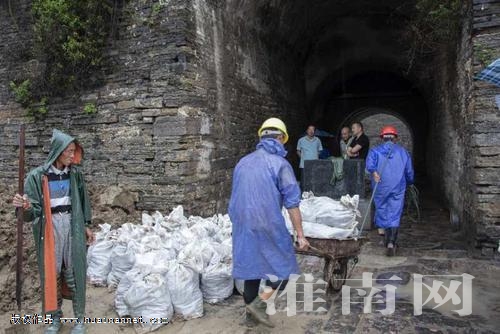 繼7月18日12時封堵古城東門賓陽門后,壽縣防汛指揮部7月19日發布通告,決定對古城北門靖淮門進行封堵。當日下午5時30分,封堵北城門的啟閉閘通過人工手搖方式進行下閘作業,北門朝西的門洞內,水利技術人員和民工們正在進行啟閉閘下方障礙物的清理工作,確保落閘后沒有縫隙。在北門西側,已經備好了防汛用土,民工們正在緊張地往編織袋裝土,做封堵城門的準備。