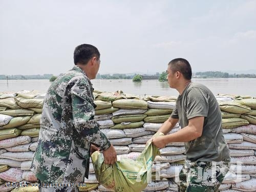 當天上午9時許,淮河早報、淮南網(wǎng)記者來到淮濱渡口,由黨員干部、民兵和村民志愿者們組成的140多人的隊伍正在堤岸堆起沙包進行加固。現(xiàn)場,身穿迷 彩服的基層民兵主動請戰(zhàn),爭當防汛“主力軍”。“90后”民兵邱保國是一名退伍軍人,7時半接到通知,8時整就趕到了現(xiàn)場;柏金龍在六安務(wù)工,7月19日得知 水位上漲,當天下午就趕到家,20日一大早就和父親柏視群來到渡口,父子一起裝沙袋堆沙包。