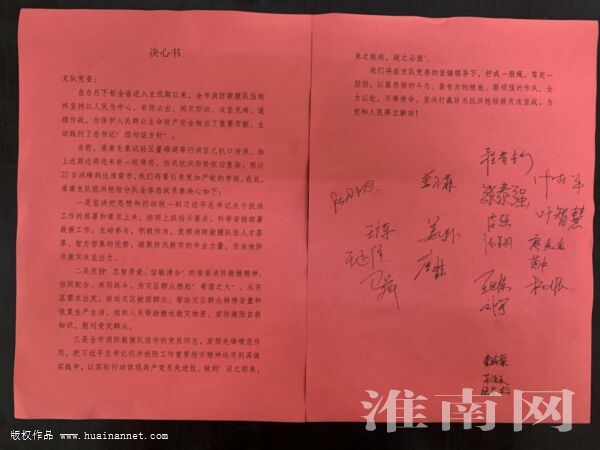 隊旗飄揚,一句話扛起使命擔當。搶救疏散人民群眾、加固大壩及路面、開展不間斷尋堤、幫助轉移人員物資。全體一線指戰員在藍紅色的隊旗下,紛紛寫下《決心書》,用一句話道出決心,“民有所呼,我有所應”、“我們要全心全意為人民服務”,一句句誓言向政府和人民表決心,讓行洪區群眾安心,淮南消防的勇士們定能去除水患,保一方平安。