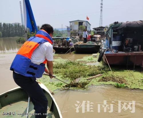圖二:7月25日下午2時30分,市海事局水上行政執法稽查大隊防汛值班人員接到船員高頻求助,在稽查大隊工作躉船上游150米處有幾條生活船被雜草纏繞,并有幾條水蛇出沒,而船上只留一女子值守,無法自行清除雜草,海事防汛值班人員立即趕到現場水域,幫忙清除雜草和水蛇,排除安全隱患。