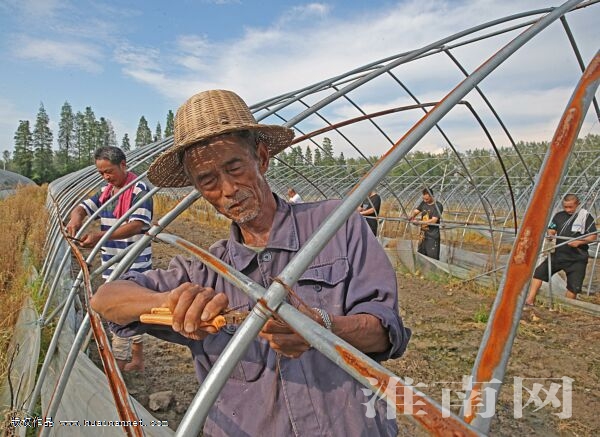 圖三:毛集實驗區四季青種植農民合作社在維修被洪水浸泡的蔬菜大棚。