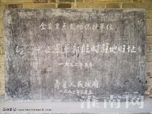 長條青石砌成的堅固的墻基,上面是堅實的青磚,木板門,格子窗,由于門前場院狹小,又有樹枝遮擋,無法拍攝小樓全景,不過抬頭的瞬間,突然被二樓木板墻上的窗玻璃的返光震懾到了,仿佛那上面還晃動著紅二十五軍干部們正在走動的身影。前一次來尋訪,主人不在家,這次又吃了閉門羹,只好從窗戶探望,里面堆滿了尋常居家的物品。走廊上豎立了一塊石碑,上面寫著:“紅二十五軍軍部臨時駐地舊址”。 李天仁先生告訴我們,福音堂兩層小樓是正陽關鎮上現存為數不多的民國建筑。1982年,壽縣人民政府將這里定為縣級文物保護單位。