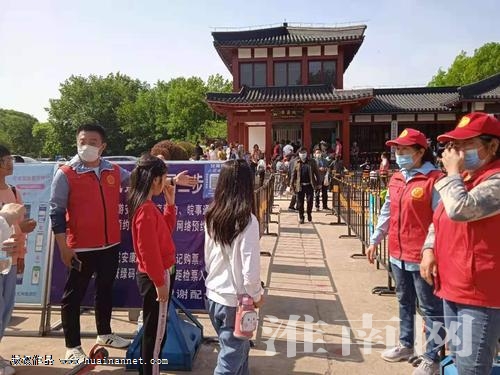 5月5日下午,淮河早報(bào)、淮南網(wǎng)記者來(lái)到八公山風(fēng)景區(qū),在景區(qū)入口,便看到一位位穿著“紅馬甲”的志愿者正為游客登記、檢測(cè)體溫。而在售票窗口旁,也有志愿者忙碌的身影,他們協(xié)助游客購(gòu)票,并解答一些游客咨詢的問(wèn)題。