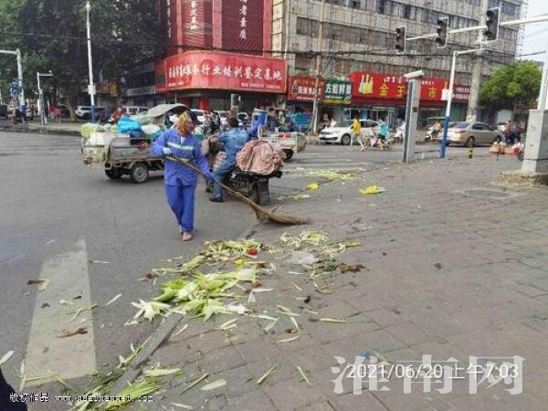 當天上午6時50分許,淮河早報、淮南網記者來到龍湖集貿市場東門附近的人民北路上,還未到東門,就聽到有喇叭聲傳來:“收了,收了,到點了!影響交通!”然后看到市容管理人員正在逐一勸導攤販盡快收拾攤點上的菜,而一旁的環衛人員則對已經清理出來的空地上的垃圾進行清掃。在現場,淮河早報、淮南網記者看到,這條道路的非機動車道被攤販占據,一直擺到公園東門口,主要販賣蔬菜、魚類等。無論是在地上鋪個大編織袋擺上菜或是直接在三輪車上兜售,他們周圍的地上無一例外都是不要的垃圾,如毛豆殼、玉米皮、洋蔥皮等。除了這些垃圾,售賣水產的攤點更是一言難盡,魚或其他水產被當場宰殺后,混著魚鱗的血水直接在馬路上流淌,順著馬路邊漫延到很遠的地方,散發著腥味。據正在清掃垃圾的環衛工人稱,這些室外攤點大概存在2年多時間了,每天早晨4點多鐘開始擺攤,直到7點多鐘才能結束,而且是在管理人員的持續勸導下才離開。攤販離開后,環衛工人要把地上的垃圾清理掉,每天都要清運10多桶菜葉等垃圾。特別是賣魚留的垃圾,因為腥味大,天氣一熱,特別難聞,他們要專門用清水沖刷。