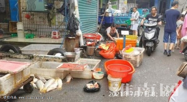 西城大市場(chǎng)西邊的一個(gè)入口處是售賣活禽和水產(chǎn)的地方,這里也是整個(gè)市場(chǎng)最臟的地方。淮河早報(bào)、淮南網(wǎng)記者看到,因?yàn)橘u活禽的門面很小,所有的活禽都放在籠子里擺在了外面,有的商鋪門口甚至堆放了七八個(gè)籠子,如此一來羽毛亂飛、地上的活禽糞便也很多。在水產(chǎn)銷售處,淮河早報(bào)、淮南網(wǎng)記者看到,每家水產(chǎn)店門前都是用瓷磚或是水泥砌了地面,大約有四五個(gè)平方,然后延伸出一到三個(gè)很寬的臺(tái)面,明顯是用來放盆的地方。可大部分水產(chǎn)店門前地面干凈,臺(tái)面上也沒擺放任何東西。而臺(tái)面的外面,卻擺了好幾個(gè)盆,甚至有些水產(chǎn)店把死了的魚直接放在地面上,地上一片濕漉漉的血水。還有一家水產(chǎn)店不在店門口擺攤,而是把攤位放在市場(chǎng)入口處,一邊售賣水產(chǎn),一邊直接殺魚,整個(gè)路面血水、魚鱗混雜,空氣中也彌漫著魚腥、雞屎的臭味。