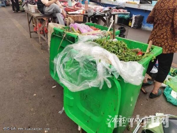 采訪當(dāng)天下著雨,淮河早報(bào)、淮南網(wǎng)記者走了一圈發(fā)現(xiàn),地面上偶見宣傳單、菜葉、塑料袋等物。從上午8時(shí)到8時(shí)45分,這些零碎的垃圾一直沒有人清掃。而整個(gè)南北走向的菜市場(chǎng)里有四五個(gè)垃圾桶,唯有中間位置的兩個(gè)垃圾桶里堆滿了垃圾,卻也無人清運(yùn)。在菜市場(chǎng)里,淮河早報(bào)、淮南網(wǎng)記者看到幾名環(huán)衛(wèi)工人在一起聊天,旁邊放了七八個(gè)空垃圾桶。