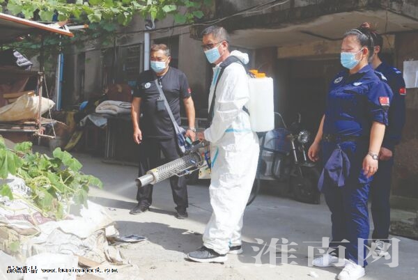 圖:淮南曙光救援隊志愿者頂著高溫在居民社區義務進行消殺作業