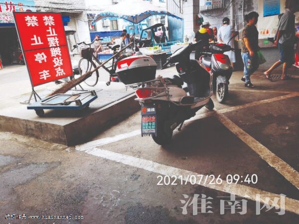 土壩孜菜市場位于八公山區土壩孜街道轄區內,緯六路北側,是一個呈南北方向的長條式室內菜市場,周邊緊鄰居民區。7月26日上午9時27分,淮河早報、淮南網記者在土壩孜菜市場中段出入口東邊看到,緊挨著菜市場的商鋪門口并沒有劃停車位,但此時還是停放了一排電動車。在菜市場中段出入口西側路邊,同樣也停放了幾輛三輪車。