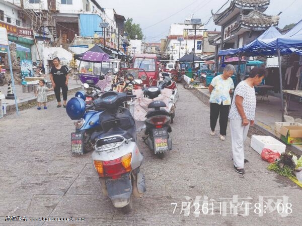 古鎮菜市場是一條東西走向的小街,小街由兩部分組成,一部分為室內菜場,另一部分則是沿街店鋪。當天上午7時50分,淮河早報、淮南網記者沿著小街由西向東走,快走到菜市場門口時,看到路中間停了很多三輪車、電動車,儼然是一處臨時停車場。買菜的居民應該習慣了在此停車,騎行至此,就把車停在這兒,然后進市場內買菜。