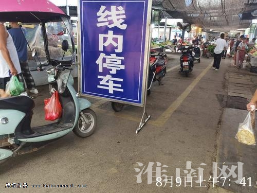 當天上午7時25分,淮河早報、淮南網記者剛到菜市場門前,就看到有工作人員駐守在此,旁邊立有“不戴口罩禁止入內”“禁止停車”等標牌,門口干凈而又整潔。市場內是一排一排的攤位,每排之間都留有很大的間距,地面上還施劃了長條框,不少電動車停放在長條框內。菜市場內有一個很大的提示牌上寫著“線內停車”,許多騎車買菜的居民自覺地把車停在了線內,不過依然有個別人根據自己的需求,隨手停放電動車,還有的人騎著電動車在市場內轉悠。