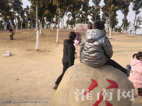 春節期間,淮河公園涌入大量游客。公園的幾塊大石頭前,已豎起警示牌,上面寫著“禁止攀爬”四個紅色大字,但總有淘氣的孩子偏要攀爬到石頭上。(記者 攝影報道)