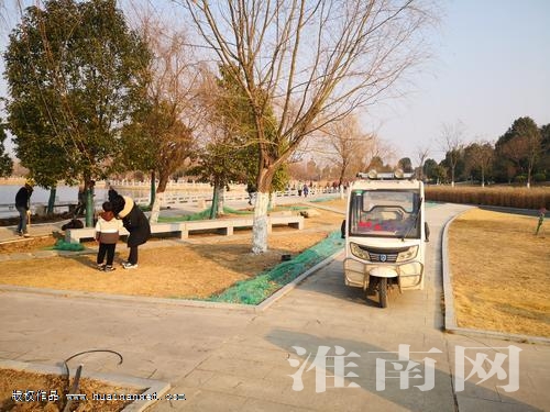 元旦期間,人們乘著晴好天氣來到中央公園游玩,有人卻將三輪車開進這里,還堵住了公園里的路。(記者 攝)
