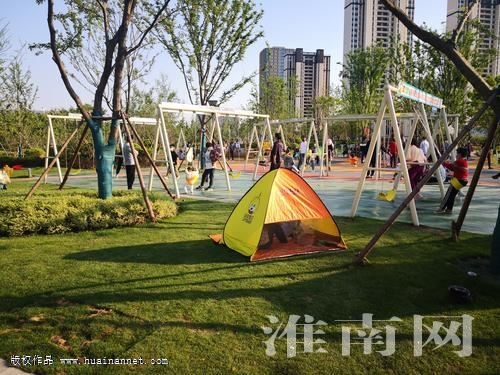 “五一”假期,天氣睛好,許多家長帶孩子來到E水系公園兒童游樂場玩耍,在游樂場邊的草地上,有人將帳篷搭在了這里。(記者 攝)