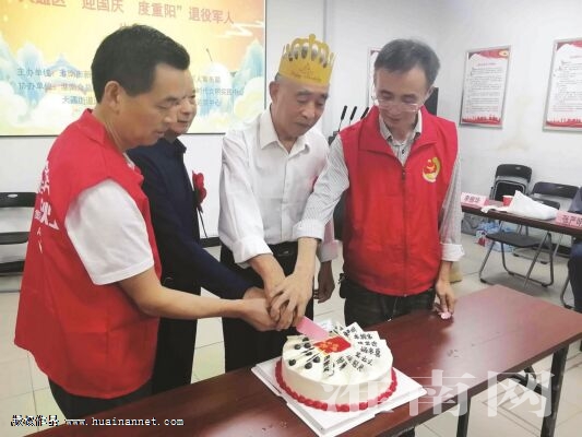 圖:趙伍(右一)與退役老兵一起切生日蛋糕(記者 張明星 攝影報道)