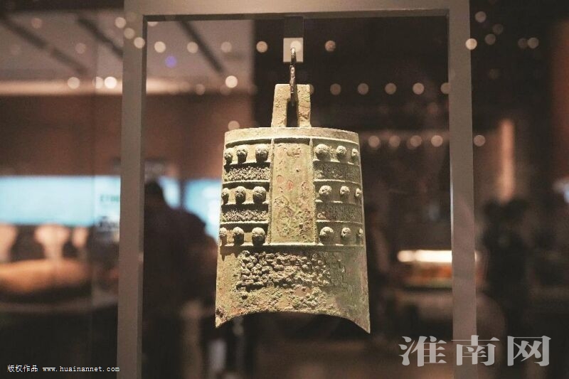 展陳在安徽楚文化博物館里的蔡侯編鐘,出土于壽縣西門蔡侯墓。1955年,考古人員發掘出的這套編鐘由9枚鈕鐘組成。其形制、裝飾花紋基本相同,大小依次遞減。器腔體作合瓦狀,較闊,口緣內凹呈弧形,舞部正中為上小下大柱狀甬,有旋,干作方形,枚下沿大于腔高二分之一。器的甬、舞、篆、鼓部飾蟠螭紋,細密繁復,凹凸有致。9器均鑄銘文,字數不等,有的自銘為“行鐘”,銘文有韻,內容反映了蔡國和楚國的關系。