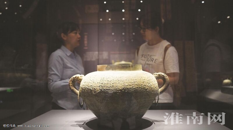 在玻璃展窗前,孫曉菲指著獸耳銜環銅罍向淮河早報、淮南網記者介紹,它是直口、鼓腹、平底,器身兩側對稱置有兩個龍首形器耳,龍口張開向里,雙耳上各有一個可以自由活動的圓環,環上雕有云紋,應該是作裝飾用。仔細端詳這件罍,其體較矮胖,青銅材質頗有質感,在造型結構和花紋裝飾上都是端莊秀麗,風格清新,看起來簡潔又不失大氣。