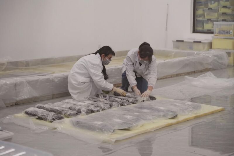 考古工作人員對武王墩一號墓出土文物采取保護措施。