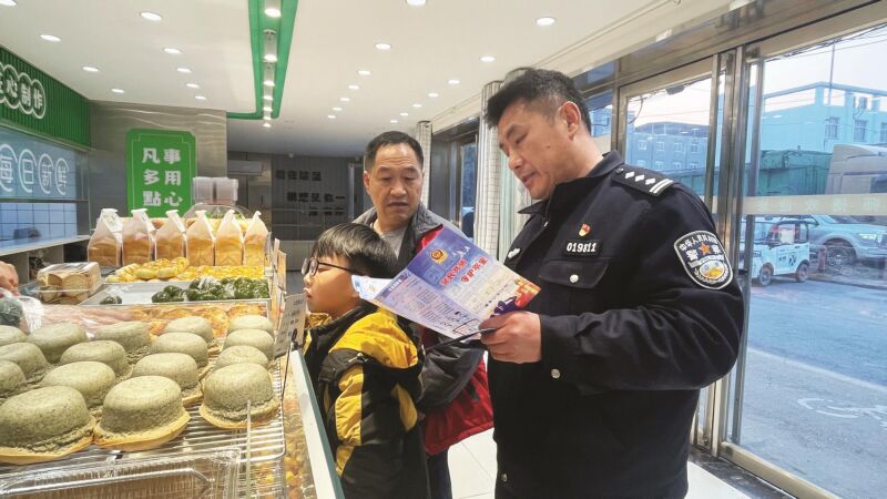 跟著民警們的腳步,記者又走進(jìn)一家蛋糕店,店內(nèi)彌漫著香甜的氣息,櫥柜里擺滿了各式各樣精美的蛋糕。此時(shí),幾位頭戴防塵帽的女店員們正忙碌著顧客包裝著糕點(diǎn),家長(zhǎng)在排隊(duì)付賬,拿到糕點(diǎn)的孩子滿臉笑容。在這里,民警們不僅送上宣傳單,還詳細(xì)跟店內(nèi)人員和顧客介紹了一些常見(jiàn)的詐騙手段和防范方法。聽(tīng)到民警們的介紹,在旁邊選購(gòu)糕點(diǎn)的一位年輕媽媽也抱著孩子走了過(guò)來(lái),好奇地詢問(wèn)關(guān)于網(wǎng)絡(luò)購(gòu)物詐騙的問(wèn)題,民警耐心地解答著。“不管遇到什么問(wèn)題呢,記得不要隨便點(diǎn)擊鏈接、不要隨便轉(zhuǎn)賬,有事就直接聯(lián)系我們派出所!”周?chē)念櫩鸵布娂妵^(guò)來(lái)傾聽(tīng),不時(shí)點(diǎn)頭表示認(rèn)同。面對(duì)他們提出的疑問(wèn),現(xiàn)場(chǎng),民警們也都一一耐心解答。