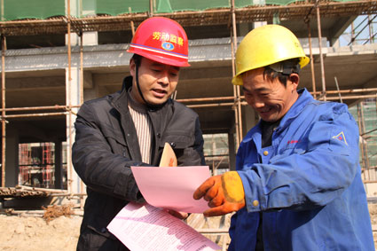 隨著年關的日益臨近,鳳臺縣進一步加大對建筑領域農民工工資支付情況檢查力度,通過廣泛宣傳、簽訂承諾書、地毯式檢查等形式,確保農民工在春節前拿到血汗錢,維護農民工的合法權益。圖為縣聯合檢查人員在向農民工發放《致建設領域農民工朋友的一封信》。