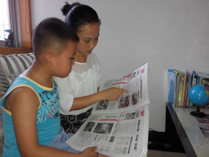 圖二:拿著《淮河早報》給兒子講述抗戰故事