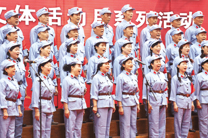 “橫斷山,路難行。天如火來水似銀。親人送水來解渴,軍民魚水一家人!碑斕煜挛3時,文藝演出在大合唱:長征組歌節選《四渡赤水出奇兵》中拉開帷幕。