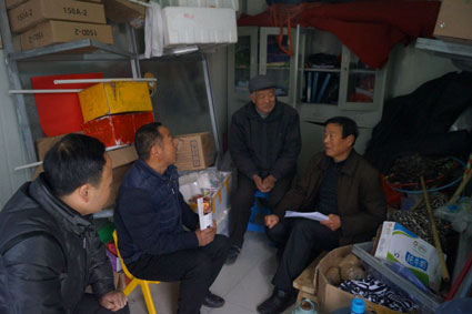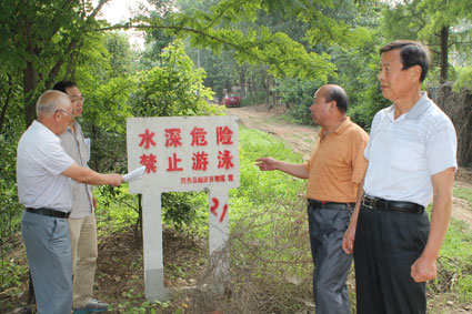 圖四:孫繼鑾(左一)查看防溺水警示牌(圖片由鳳臺經濟開發區關工委提供)