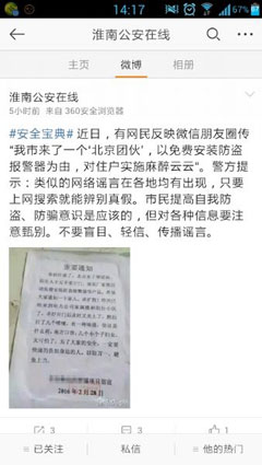 這條消息是否是真的呢?淮河早報、淮南網記者與趙先生一同向淮南警方求證。警方回復表示,此消息不真實,也沒有接到過類似報警。隨后,淮河早報、淮南網記者看到淮南市公安局官方微博“淮南公安在線”已經進行辟謠。微博內容為:“#安全寶典#近日,有網民反映微信朋友圈傳‘我市來了一個‘北京團伙’,以免費安裝防盜報警器為由,對住戶實施麻醉云云’。警方提示:類似的網絡謠言在各地均已出現,只要上網搜索就能辨別真假。市民提高自我防盜、防騙意識是應該的,但對各種信息要注意甄別。不要盲目、輕信、傳播謠言。”并附有網民轉發的消息圖片。