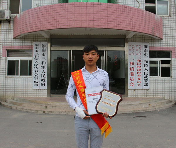 一個95后淮南小伙,從看到有人落水到一個猛子扎入水中救人只用了短短幾秒鐘的時間,他當時的內心世界又是怎樣的獨白?日前,淮河早報、淮南網記者在三和鎮見到了這位見義勇為的帥小伙鄒四蓓,和上海市頒發的那份沉甸甸的榮譽。