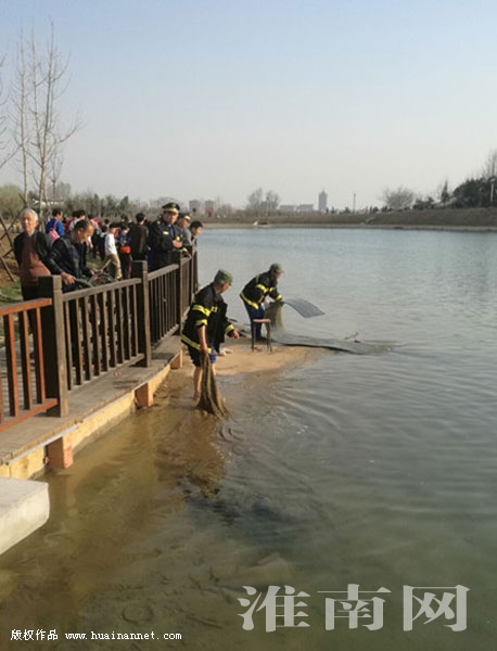 隨后,淮河早報、淮南網記者跟隨管理人員來到仙女湖。在仙女湖北岸,淮河早報、淮南網記者看到,在水中沉著的兩條約四米長、半米寬的黑色運輸皮帶十分顯眼。管理人員和工人將兩條運輸皮帶清理上岸,并抬上車運走。之后,管理人員又來到老龍眼水庫,對游泳者鋪在水中的毯子進行了清理。
