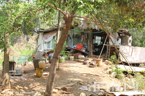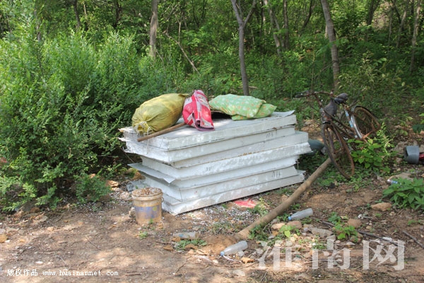 接電后,淮河早報、淮南網記者來到這個曾經多次被“拆除”的地段。沿著一條連接環山路的石灰小路走過去,一個院子出現在眼前,遠遠地就能聞到一股惡臭,旁邊的一塊地面因長期被污水等雜物浸泡,已漚成了一個臭泥潭,周圍散落著用來飼養家禽的爛菜葉和動物內臟,空氣中濃烈的臭味令人作嘔。原本的窩棚還在,在窩棚周圍,以前被拆除的雞窩、狗窩又被一些雜物搭建了起來。院子里還堆放了一些彩鋼塑料泡沫的廢舊建材。這塊地方在美麗的舜耕山風景區內顯得格外刺眼,就像一個牛皮癬一樣,牢牢地粘在青山綠水之中。