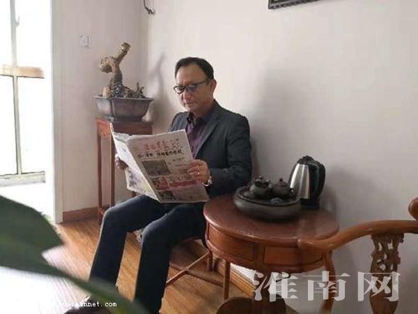 圖:隋東聯每次回到家鄉最喜歡閱讀《淮河早報》,了解淮南的大事小情。(記者 )